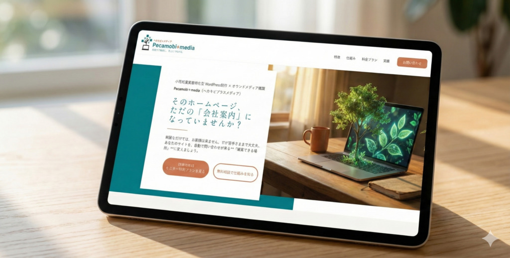 小規模事業者特化型 WordPress制作 × オウンドメディア構築 Pecamobi+media(ペカモビプラスメディア) そのホームページは「経費」ですか? それとも「資産」ですか? ただ存在するだけのサイトは、もう要らない。「プロ仕様の集客システム」を構築し、面倒な運用はすべて丸投げ。あなたの知識と経験を、24時間利益を生む「資産」に変えます。 今日、お客様に聞かれたことを、LINEで教えてください。 月額5万円で雇える『AIを駆使するWeb担当』が、 あなたの答えを集客記事に変えます。 【先着5社限定】モニター特別プランを見る 無料相談で仕組みを知る Worries とりあえず作っただけのHPが、ネット上の『空き家』になっていませんか? 社長の仕事は「現場」であり、パソコンの前に張り付くことではありません。 しかし、放置されたホームページは、サーバー代を食いつぶすだけの「負債」になってしまいます。 誰にも見られていない デザインは綺麗だけど、アクセスがほとんどない。問い合わせも来ない。 更新する時間がない 業務が忙しくてホームページを更新する暇がない。専門知識もなくて触り方がわからない。 人を雇う予算がない Web担当者を雇いたいが、月20万円以上の固定費を払う余裕はない。 その原因は、あなたのビジネスの魅力不足ではありません。「Webサイトを集客装置として動かす仕組み」がなかっただけです。 Matching Pecamobi+mediaは、 このような経営者様に最適です ⭕️おすすめする方 本業(実務)が忙しく、時間が取れない方 自社の「技術」や「知識」を、集客資産に変えたい方 一過性の広告ではなく、積み上がる資産を持ちたい方 ❌ おすすめしない方 すべてを丸投げして、協力(LINE返信)すらしたくない方 ※あなたの「専門知識(メモ)」だけは必要だからです。 あなたのサイトの『集客力』を無料診断! 25の質問に答えるだけで、今の課題と対策が明確になります。 ✅ 3分で完了 ✅ 登録後すぐにメールで届く ✅ 改善アドバイス付き お名前(姓のみで可) Email 今すぐ診断シートを受け取る Solutions Pecamobi+media が選ばれる3つの理由 01 集客特化型デザイン ただ綺麗なだけじゃない。「売れる」動線設計 デザインの美しさは当然。大切なのは「どうやって問い合わせボタンを押させるか」です。マーケティング心理学に基づいたサイト設計で、訪問者をスムーズに顧客へと導きます。 02 オウンドメディア構築 広告費ゼロで集客する「資産型メディア」 毎月広告費を払い続けるのはやめましょう。ブログ機能を活用した「オウンドメディア」を構築し、寝ている間も自動で検索からお客様を集める「資産」を作ります。 03 AI自走システムの構築 AIを味方につけた「自走できる」仕組み 更新や集客を制作会社に丸投げするのではなく、専用AIを活用して「社内で回せる」体制を構築します。コストを抑えながら、スピーディーな情報発信が可能になります。 Success Logic アクセスを「売上」に変える勝利の方程式 ❶.ブログ集客 更新されるブログにより集客する。 ❷.お役立ち資料無料ダウンロード お役立ち資料などを無用ダウンロードしてもらうことによりメールアドレス入手。 ❸.ステップメールで信頼構築 入手したメールアドレス宛にステップメールを自動送信し、信頼を構築していきます。 ❹.無料相談・成約 信頼を構築した方からZOOMで無料相談、成約へとつながります。 ブログ集客 お役立ち資料 無料ダウンロード ステップメールで 信頼の構築 個別相談・成約 Demo Works デモサイト紹介 実際の「納品クオリティ」を、 その目で確かめてください。ターゲットに合わせて、デザインの世界観は自由自在。どのサイトにも、先ほどの「集客自動化の仕組み」が標準装備されています。 「デザイン」を見るのではありません。 「自動で集客する仕組み」を体験してください。 Pecamobi+mediaが提供するのは、ただのホームページではなく「24時間働く営業マン」です。 記事を読んだ見込み客が、資料をダウンロードし、自動でメールが届き、気づけばZoom相談に申し込んでいる。 その「お客様が向こうからやってくる流れ」を、デモサイトで実際に操作して体感してください。 ブログから「お役立ち資料」への自然な誘導 (売り込み感なく、お客様が自ら「欲しい」と手を挙げる仕掛け) アドレス登録後の「ステップメール自動配信」 (あなたが寝ている間も、システムが自動で信頼関係を構築します) 最終ゴールへの「Zoom相談」申込み動線 (「お願いします」と頼まれる状態で、カレンダーに予約が入ります) デモサイトを見る お知らせ お知らせ一覧 外国人雇用に関するセミナー開催のお知らせ 年末年始の休業日についてのご案内 ホームページリニューアルのお知らせ アクセス Pecamobi+media 〒542-0081大阪市中央区南船場1-3-14-204